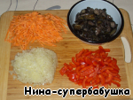 - Грибы (замороженные, лесные, у меня домашняя заготовка) — 250 г