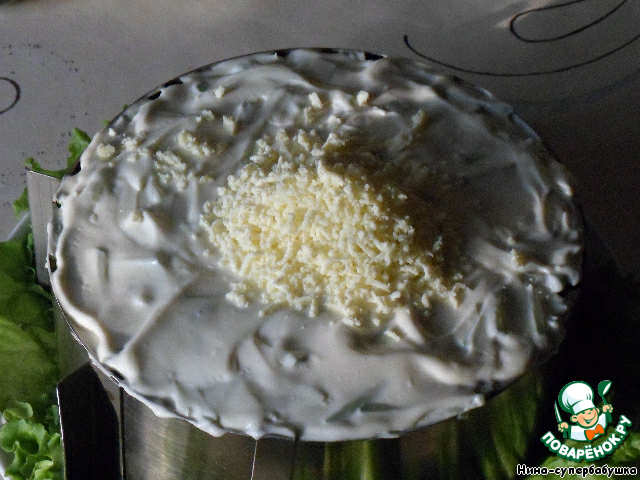 Салат смазать майонезом и засыпать желтками, натертыми на мелкой терке.