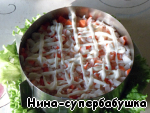 Следующим слоем выложить мелко нарезанное крабовое мясо и снова нанести сеточку из майонеза.