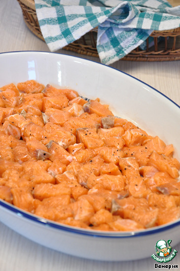Семгу нарезать небольшими кусочками, посолить, поперчить.