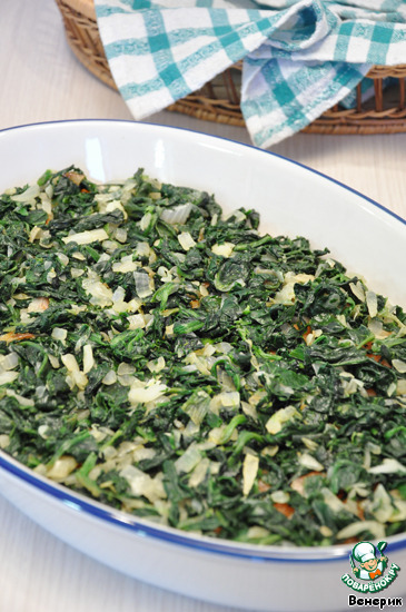 Лук очистить, мелко нарезать, спассеровать в 1 ст. л. сливочного масла. Добавить к луку шпинат (размороженный, отжатый от воды и нарезанный). Тушить шпинат 7-8 минут.