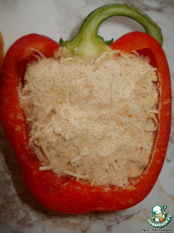 Затем панировочными сухарями (на каждую половинку перца у меня пришлось по 2 ч.л. панировочных сухарей).