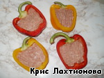Перцы начинить фаршем, но не до самых краев.