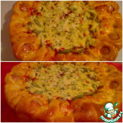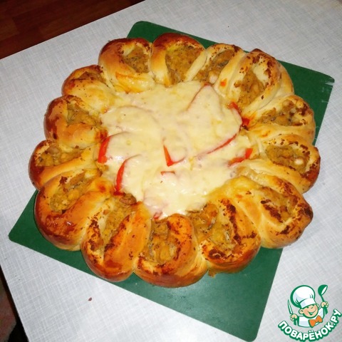 Красивый и очень вкусный пирог, который украсит ваш стол не только в праздники, но и в будни! С начинкой можно пофантазировать - я пекла и с сeмгой, и с сосисками, нам очень понравилось, попробуйте и вы!