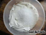 Начнем с мороженого. Как я уже писала, это мороженое я "стянула" у Ю. Высоцкой. Плюс его в том, что оно относительно некалорийное. В нем нет ни сливок, ни яиц, а жирность его зависит от жирности сметаны. Да и сахара я кладу немного. А еще оно застывает за 2 часа. Минус этого мороженого в том, что если оно слишком долго стоит в морозильнике, то становится слишком твердым. Короче, приступим. В сметану добавляем 3 столовые ложки сахара.