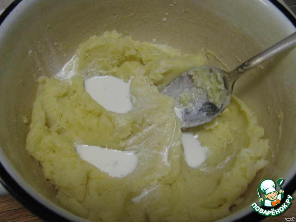 Добавить в картофель сливочное масло, сливки и муку. Перемешивать, пока масса не станет плотной. |
