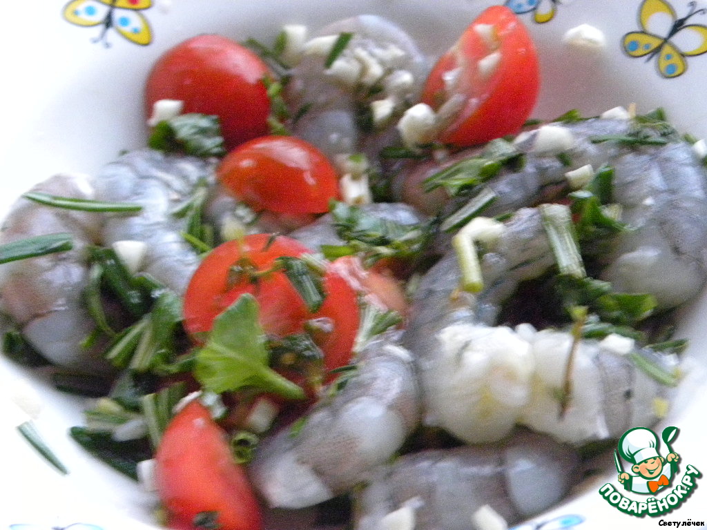 Креветки смешать с чесноком, половинками томатов черри, рубленым базиликом, листьями тимьяна, розмарином, оливковым маслом, перцем и солью.