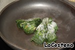 Тем временем приступим к приготовлению яичницы. На сковороду с оливковым маслом выложим замороженный шпинат.
