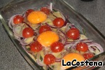 Помидоры черри помыть, порезать и выложить на лук. Отставить на некоторое время.