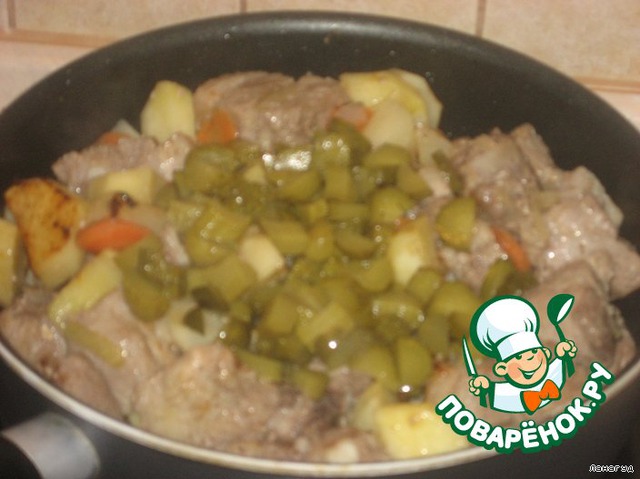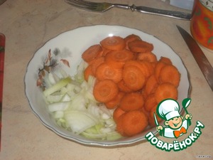 Добавить лук с морковкой к мясу,слегка обжарить.