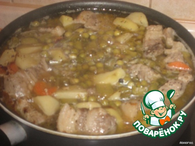 Залить водой,посолить,пасластить по вкусу,добавить любимые специи и тушить до упаривания жидкости и готовности мяса.