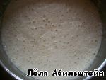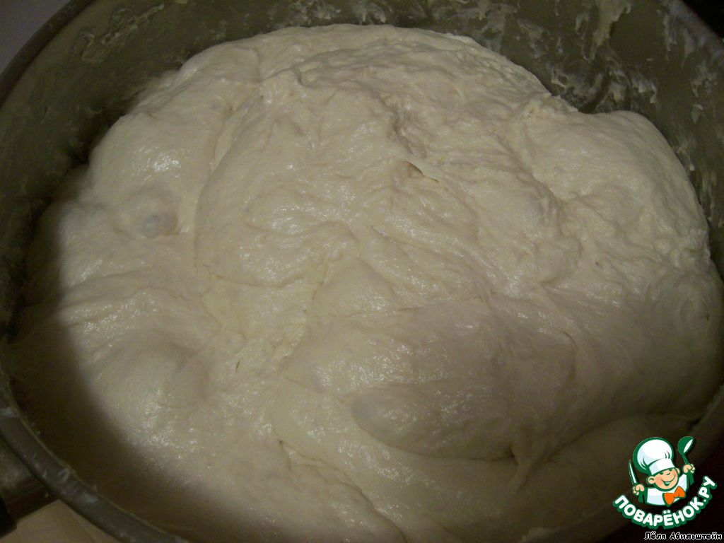 Сначала ставим опару. Сыворотку чуть-чуть подогреваем, высыпаем туда дрожжи, сахар и муку. Перемешиваем. Накрываем крышкой и даем побродить часов 5. Опара должна запузыриться и подняться.