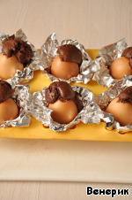 В форму для кексов положить фольгу, для устойчивости «яиц», на фольгу положить яйца, и запечь в нагретой духовке до 180 гр. 15-20 минут. Я запекала 20 минут. -