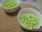1. Огурец почистить и нарезать мелким кубиком, посолить и дать постоять 10 минут.