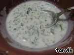 5. Йогурт смешать с лимонным соком и оливковым маслом. Посолить, поперчить и смешать с рубленой петрушкой, укропом и луком.
