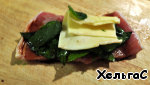 Вовнутрь каждого кусочка положить зелень, у меня шпинат, можно спаржу (аспарагус зеленый)