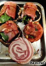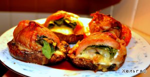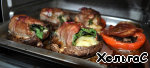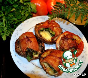 В каждую грибную шляпочку положим мясной рулетик, а в помидорную шляпочку грибные ножки и накроем куском бекона