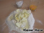 Муку просеиваем с разрыхлителем. К муке добавляем 125 гр. сахара, сл. масло (маргарин), 4 желтка, слегка посолить.