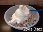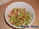Кусочки ревеня соединяем с 60 гр. кукурузного крахмала, тщательно перемешиваем. Вводим взбитые белки и вновь аккуратно перемешиваем, чтобы все кусочки ревеня были окутаны белковой массой.