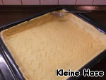 Песочное тесто не любит хорошо раскатываться, я раскатала до примерного размера формы, перенесла на противень, а дальше руками распределила по всей поверхности, сделав бортики. Теперь берём вилку и делаем частые наколы. -