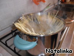 Выкладываем лапшу в сковороду. Мы разделили её на две сковороды, чтобы лучше прожарилась.