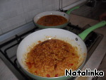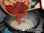 Поджариваем на половине масла лук. Когда он станет золотистым, добавляем нарезанные помидоры, выдавливаем чеснок и петрушку. Солим.