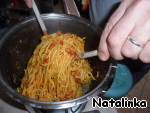 Когда спагетти готовы, сливаем воду и смешиваем лапшу с соусом.