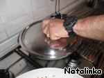 Когда снизу образуется корочка, чтобы перевернуть, накрываем крышкой или тарелкой.