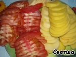 Картофель и помидоры нарезаем кружками.