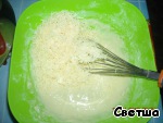 Заводим жидкое тесто: стакан сметаны + стакан майонеза + 3 яйца, хорошо перемешать, всыпать муку и добавить соды на кончике ножа. Еще раз перемешать, затем добавить тертый сыр.