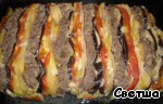 В форму выкладываем поочередно вертикальными слоями картофель,фарш,баклажаны и помидоры... Сверху раскладываем лук без маринада.