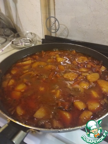 Залить водой (или бульоном) так, чтобы был покрыт весь картофель, тушить на среднем огне до готовности - картофель должен стать мягким.