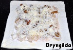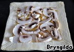 Далее так же тонко нарезала вешенки и размоченные сухие грибы и тоже выложила на корж. И опять брызнула немного масла. Чуточку посолила.