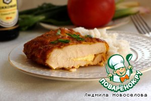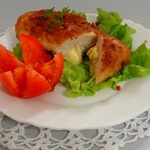 Филе грудки надрезать в виде кармашка или как книжка, вложить ломтик мягкого сыра.
