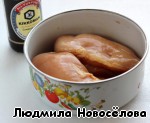 Куриное филе замариновать в соевом соусе и оставить на ночь в холодильнике.