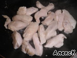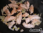 Промыть филе курицы и нарезать полосками. Обжарить полоски курицы в разогретом масле до золотистого цвета.