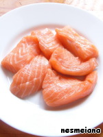 Филе нужно разделить на кусочки. У меня на каждую порцию идет примерно 80 г семги (2 кусочка по 40 г). |
