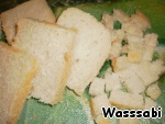 С хлеба острым ножом срезать корочки, измельчить (нарезать кубиком).