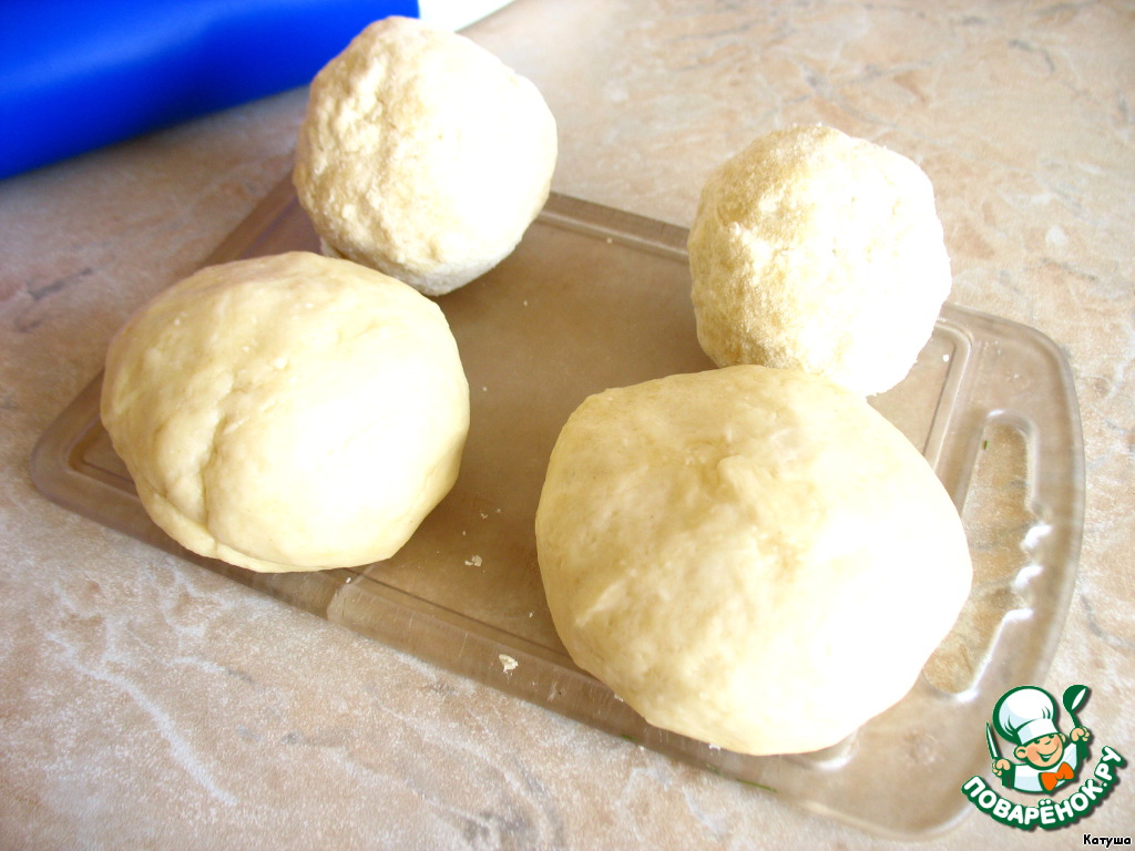 Каждый кусочек положить на срез, приплющить ладонью, раскатать скалкой в круг.
