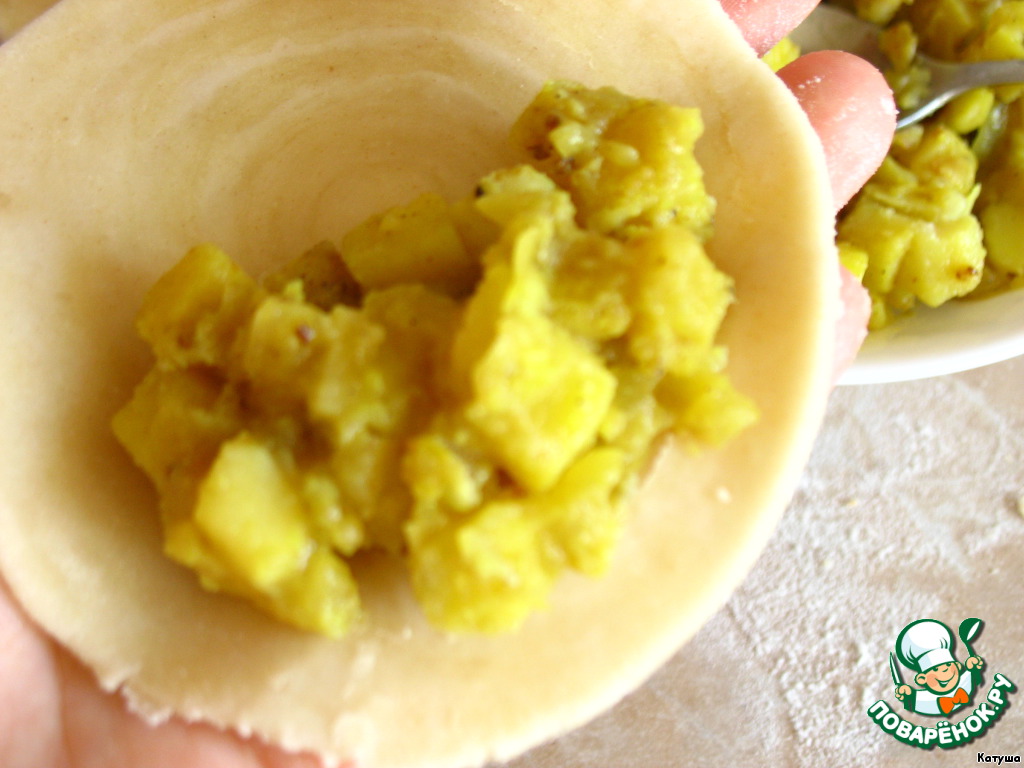 Начинка. Обжарим лук и чеснок, добавим карри, перемешаем. Положим картофель, нарезанный мелкими кубиками,