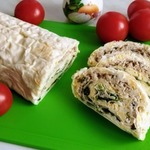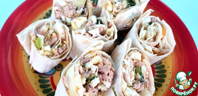3 лаваш - консервированную рыбу размять в тарелке, смешать с майонезом. Выложить на третий лаваш.