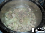 Берем куриное филе, белое, красное по своему вкусу. Режем мелким кусочками. Отправляем в кастрюлю с толстым дном обжариваться, затем режем лук полукольцами, добавляем к курице, тушим минут 7-10. -