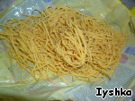 У меня дома оказалась только вот такая лапша, а домашнюю делать было некогда, муж уже торопился с работы домой. В идеале в этом блюде должна быть домашняя лапша, либо широкая, как для лагмана (хорошо подойдут гнезда).