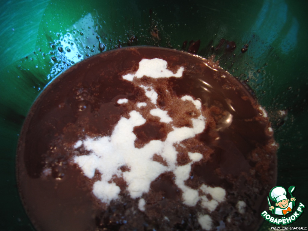 сначала наша смесь будет иметь консистенцию, похожую на глазурь, затем, по мере взбивания, она будет густеть...