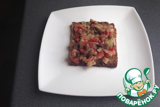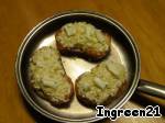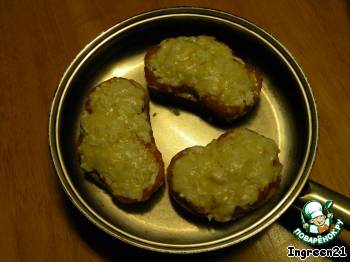 Берем ломтики хлеба и выдавливаем на них чеснок (я натерла на терке весь чеснок, а потом распределила на хлеб).