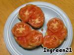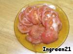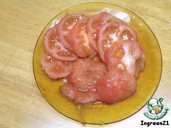Помидоры ошпарить кипятком, снять кожицу и порезать кольцами