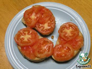 Укладываем помидоры на хлеб. Я люблю, чтоб помидор было много, поэтому уложила их близко-близко.