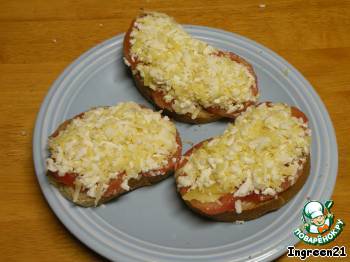 Распределяем весь сыр поровну. Количество сыра контролируйте сами по вашему вкусу. Сыр может крошиться и "убегать" с бутерброда. В таком случае просто слегка прижмите сыр ладонью к бутерброду.