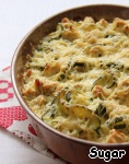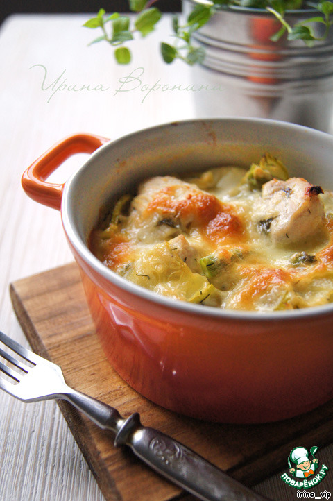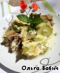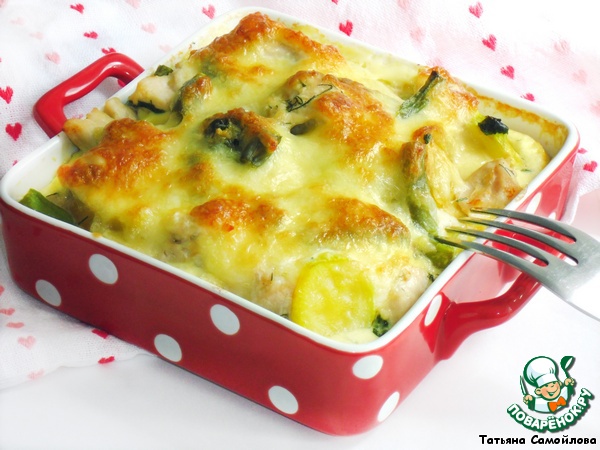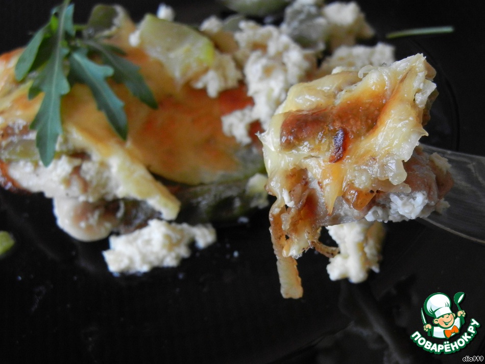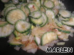 Лук очистить и мелко нарезать, затем обжарить в соке, образовавшемся от жарки курицы. Цуккини нарезать кружочками и обжарить вместе с луком. Добавить соль, перец, мускатный орех и чеснок.