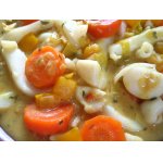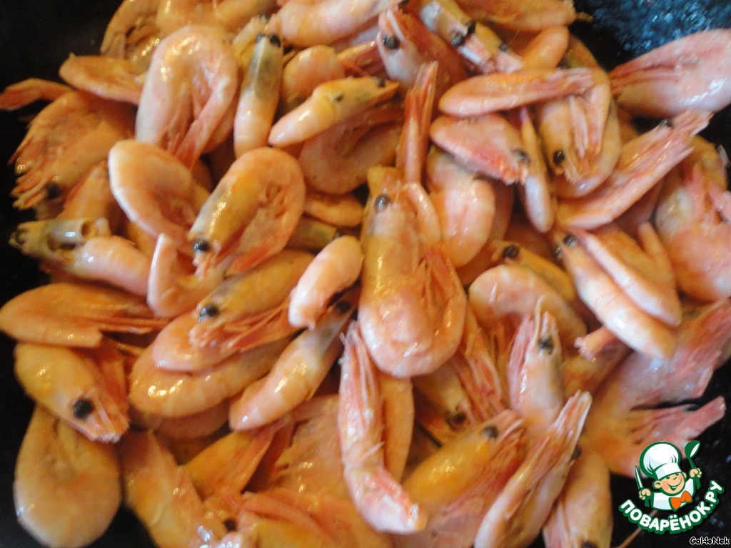 Бросаем туда креветки, хорошо перемешиваем и готовим минуты 3, не больше, т. к. если готовить долго, морепродукты станут "резиновыми".